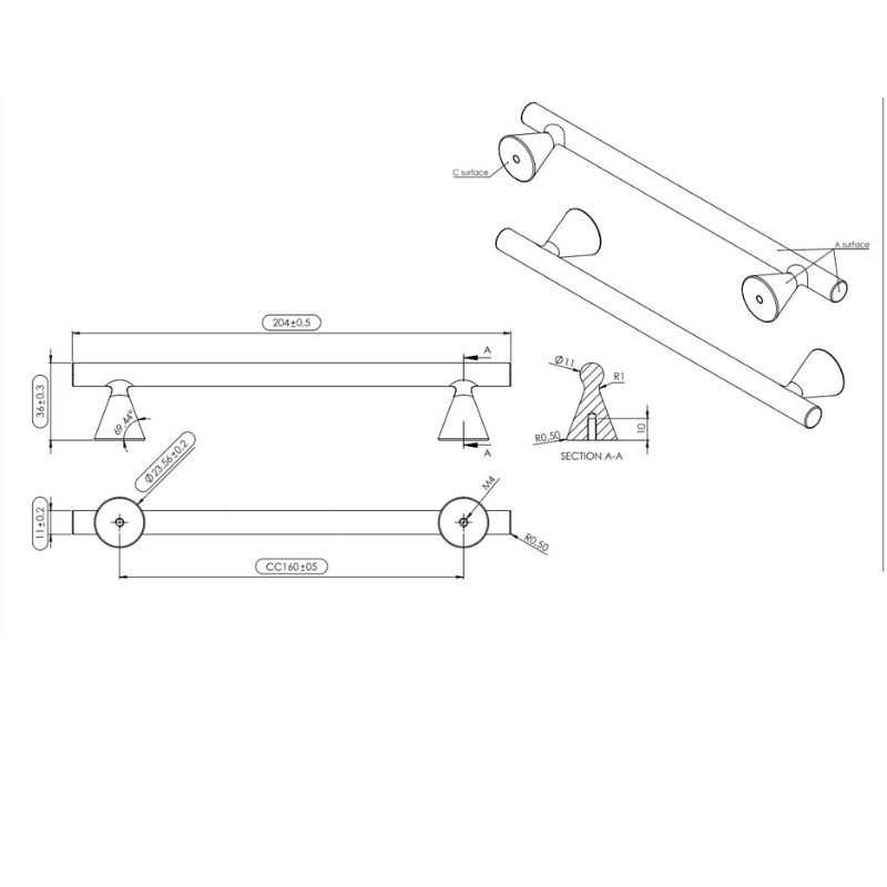 - Fonctionnalité: Entraxe 160 mm, largeur totale 204 mm, hauteur 36 mm, diamètre des pieds 23,5 mm, adaptée aux meubles jusqu’à 19 mm d’épaisseur.