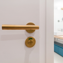La poignée de porte Thelma en finition dorée mate avec une rosace ronde à ressort offre une élégance sobre à toute porte intérieure. Sa finition dorée mate grâce au traitement PVD confère une sophistication discrète à chaque pièce, tandis que la forme ronde de la rosace lui confère une esthétique contemporaine qui s'harmonise avec tous les décors.