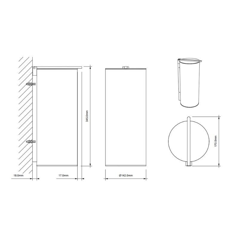 - Fonctionnalité: installation murale gain de place, couvercle soft-close, conteneur intérieur amovible, capacité d’environ 2,6 L, dimensions env. 34,5 x 14 x 17,5 cm.